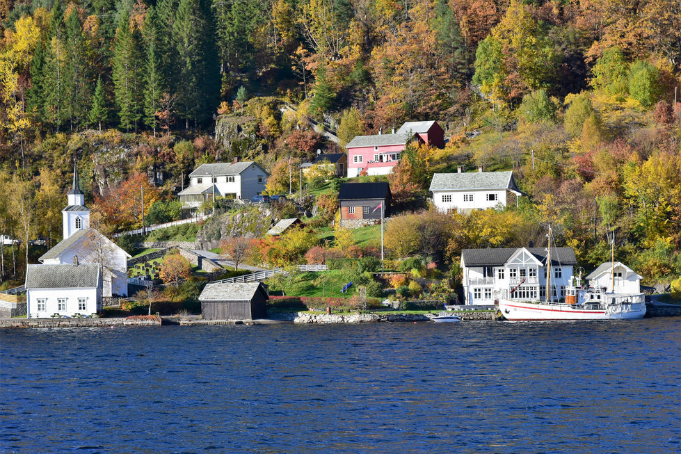 Jetzt laufen wir erstmal zur Information. Morgen soll das Wetter noch gut sein, Samstag aber soll es den ganzen Tag regnen. Das wäre aber unser geplanter Tag im Nærøyfjord gewesen. Also disponieren wir um und buchen für morgen eine Tour mit Bahn, Bus und Schiff, die sogenannte „Norway in a Nutshell Tour“. Mehr dazu morgen. Für heute entschließen wir uns zu einer Schifffahrt in den Osterfjord. Das dauert 3 Stunden und bei herrlichstem Sonnenschein wollen wir den Tag sinnvoll nutzen. Eine gute Entscheidung! Die Fahrt ist zauberhaft und bietet uns Postkartenmotive, sozusagen Bilderbuchnorwegen.