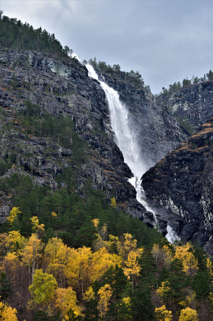 Da ich gelesen habe, dass 20 Minuten entfernt ein schöner Wasserfall ist, versuchen wir es doch gleich mal damit. Man kann sagen, der Versuch ist gescheitert. Der Latefossen schießt von zwei Seiten den Berg hinunter und dann unter der Straße hindurch. Leider wird die Straße gerade erneuert, eine einzige Baustelle, an ein Foto ohne Bauwagen und Maschinen ist nicht zu denken. Also weiter, unser Tagesziel heißt Bergen.