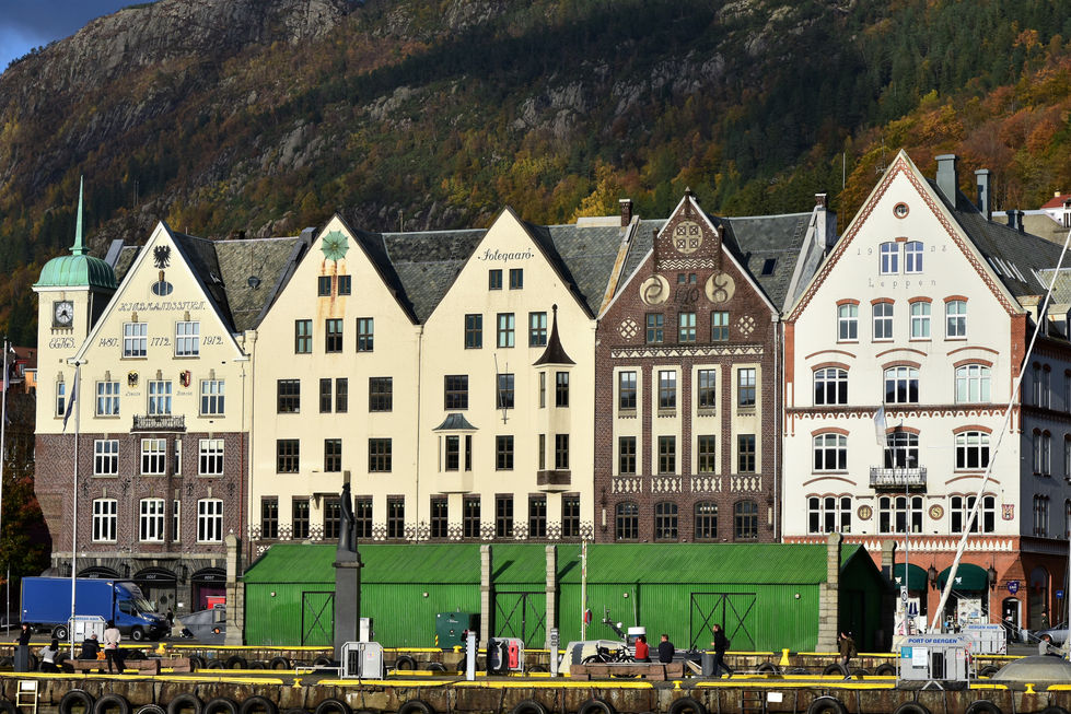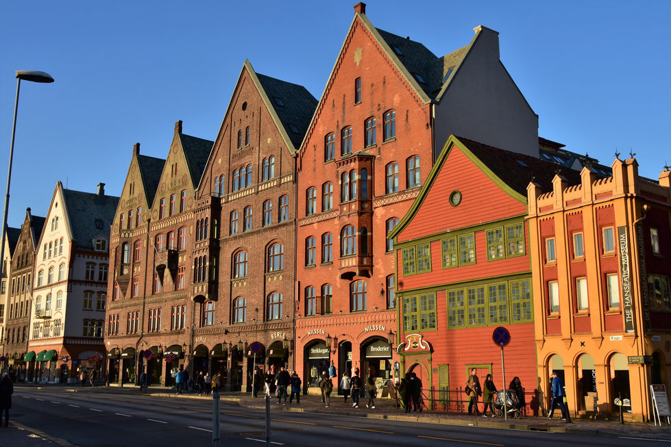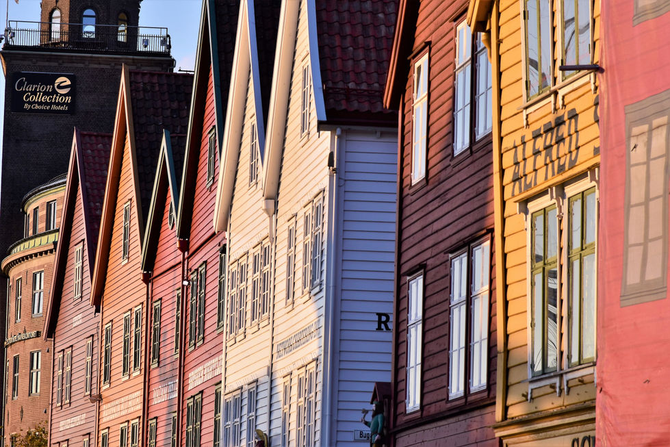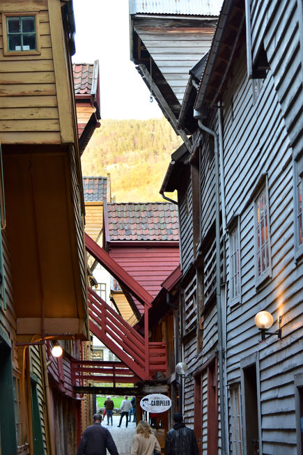 In Bergen hat der Regen dann aufgehört und die Sonne kommt langsam raus. Wir schauen uns gleich mal Bryggen an, das alte Hanseviertel am Hafen. Das Hafenviertel Bryggen, das von der UNESCO zum Weltkulturerbe erklärt wurde, ist der älteste Stadtteil Bergens und liegt im Zentrum der Stadt. Die Hanse, eine Vereinigung niederdeutscher Kaufleute, errichtete im Jahre 1360 im Hafenviertel Bryggen eine Handelsniederlassung, die den Handel in der Stadt 400 Jahre lang kontrollierte. Im Jahr 1702 wurden die meisten alten Gebäude im Hafenviertel Bryggen durch einen Großbrand zerstört, jedoch erfolgte nach dem Brand ein Wiederaufbau im alten Stil, sodass das Viertel auch heute noch so aussieht, wie im 12. Jahrhundert. Die vielen traditionellen Holzhäuser machen das Hanseviertel zu einem der bekanntesten Mittelalterviertel Norwegens. Das dicht bebaute Hafenviertel wird von engen Gassen durchzogen, die die langen Häuserreihen voneinander trennen. Im hinteren Teil des Stadtviertels sind einige Keller aus dem 15. und 16. Jahrhundert erhalten geblieben. Heute beherbergen die alten Holzhäuser die unterschiedlichsten Gewerbe, von dem unvermeidlichen Souvenirshop über ein Hotel, einen Nachtclub bis zu Boutiquen ist alles vertreten. In den Hinterhöfen findet man dann auch Kunsthandwerk und Restaurants, man sollte auf keinen Fall nur die Hafenfront von vorne besichtigen!