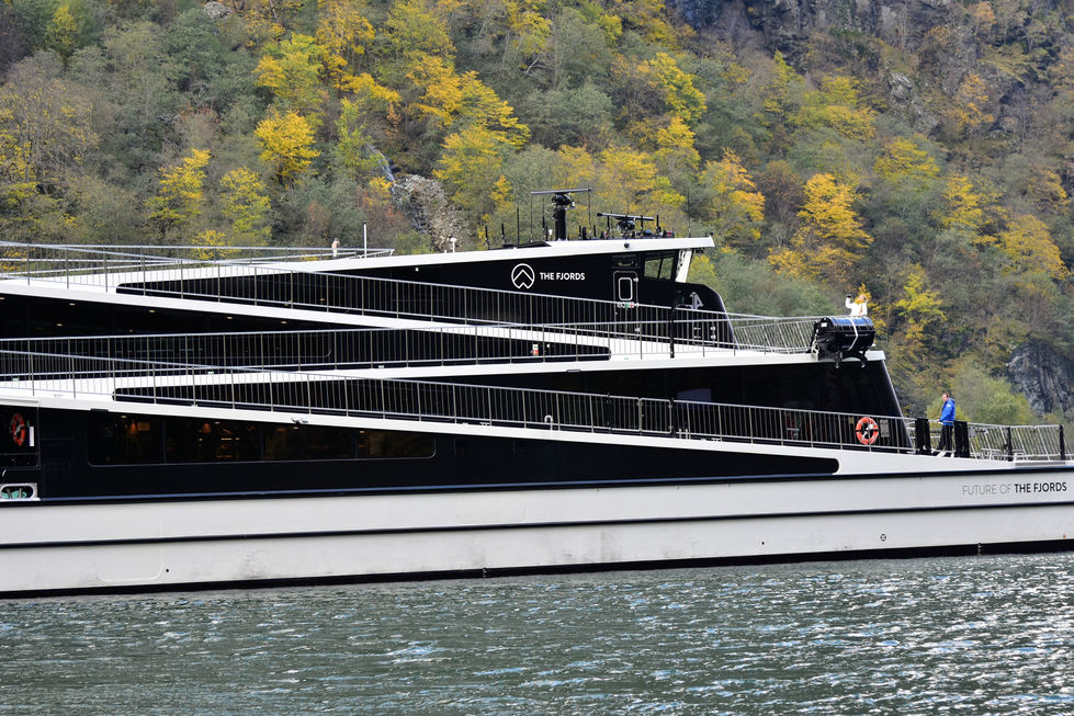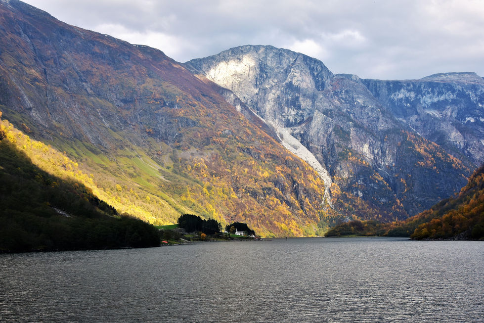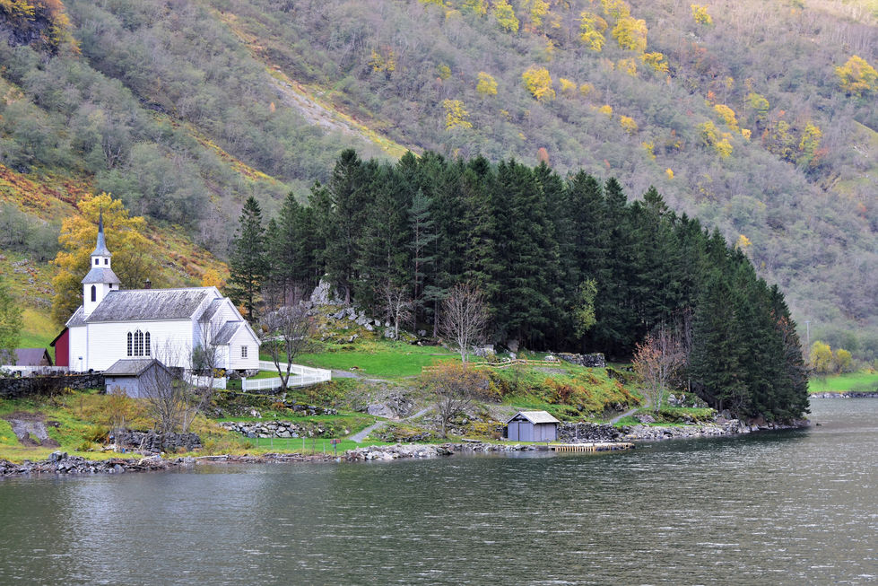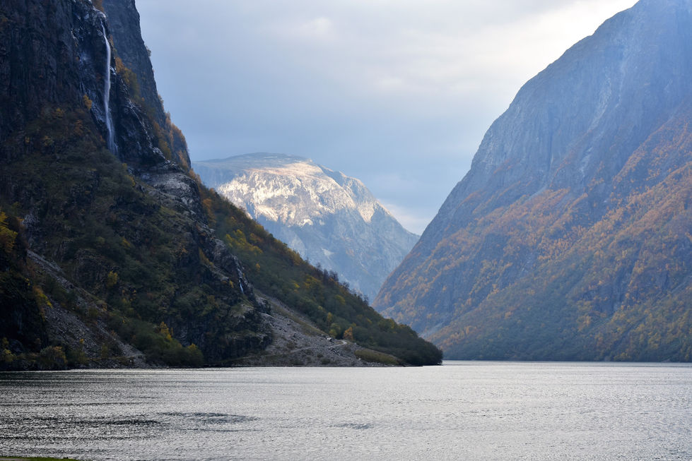 „Norway in a nutshell“ beschreibt eine Tour mit Bahn, Bus und Schiff von Bergen über Voss bis Flåm und zurück nach Bergen. Der Name rührt daher, dass man in nur einem Tag einige der typischen norwegischen Landschaften zu sehen bekommt - Berge, Fjorde und Wasserfälle. Eigentlich hassen wir solche Touren mit Massen anderer Touristen nach vorgefertigtem Zeitplan, da die Wettervorhersage aber dermaßen schlecht ist, beißen wir in den sauren Apfel. Mit dem Zug geht es zunächst von Bergen nach Voss in ca. einer Stunde. Ein Bus bringt uns nach Gudvangen, an das Ende des Nærøyfjordes. Nach einer kurzen Pause beginnt die zweistündige Fjordfahrt bis Flåm. Wir fahren auf der „Future of the Fjords“, einem hochmodernen, rein elektrisch betriebenen Schiff. Das ist super leise und hat viel Platz für alle. Inmitten der unberührten Natur der norwegischen Provinz Sogn og Fjordane ist der Nærøyfjord zu finden, der gemeinsam mit dem Geirangerfjord von der UNESCO zum Weltnaturerbe erklärt wurde. Der 19 Kilometer lange Nærøyfjord, der von bis zu 1.800 Meter hohen Bergen umgeben ist, gilt als der schmalste Fjord der Welt. An seiner schmalsten Stelle misst der Fjord lediglich 250 Meter. Zahlreiche Wasserfälle stürzen die steilen Berghänge hinab. Hoch über dem Fjord sind immer wieder einzelne Bauernhöfe zu sehen, die keine Straßenanbindung haben. Die alten Höfe erinnern an längst vergangene Zeiten, als die Fjorde die wichtigsten Verkehrswege Fjordnorwegens waren. Der Nærøyfjord ist voller Kontraste. Hier wechseln sich unberührte Naturlandschaften und blühende Kulturlandschaften ab. Die Fjordufer sind von dichten Wäldern und üppigen Wiesen bewachsen, während die Hochebene an vielen Stellen von Gletschern bedeckt ist. Auch bei bescheidenem Wetter, wie heute, ein Erlebnis.