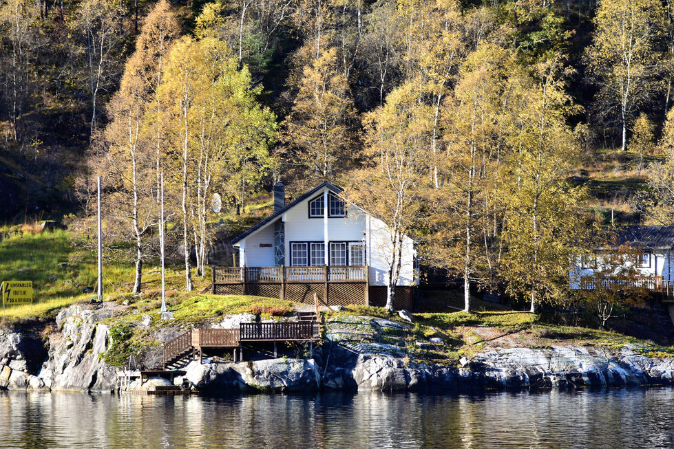 Heute Morgen hat es zunächst aufgehört zu regnen, sodass wir uns mal anschauen können, wo es uns eigentlich hin verschlagen hat. Die Lage unserer (wunderschönen) Ferienwohnung ist außergewöhnlich, liegt sie doch genau zwischen dem Fjord und dem See auf einem Hügel. Es ist zwar stark bewölkt, aber wirklich schön.